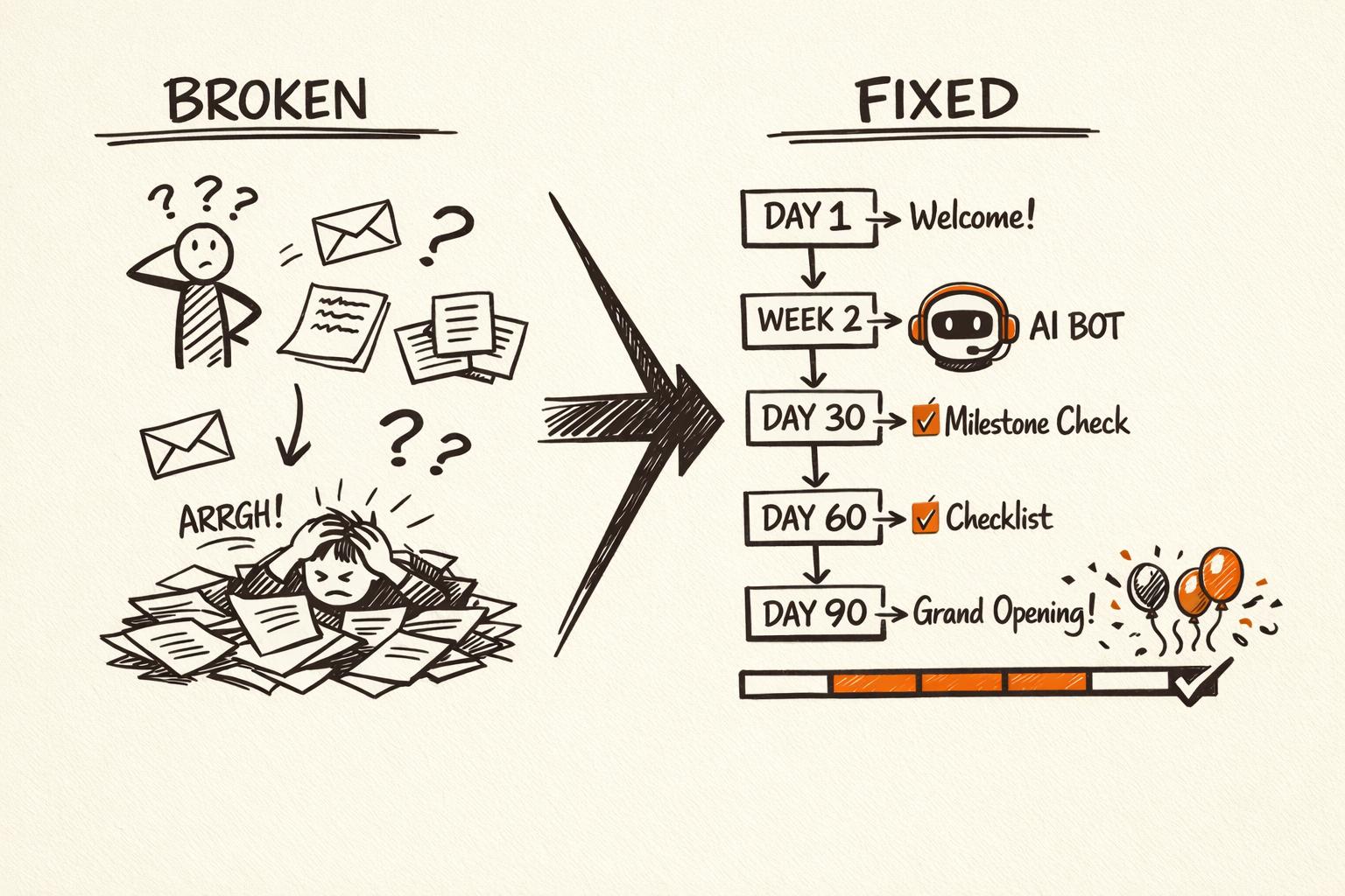 Your operations team did not sign up to answer the same 20 questions 47 times per franchisee. They signed up to help franchisees succeed. But when onboarding is manual, 80% of their time goes to reactive fire-fighting instead of proactive coaching.
